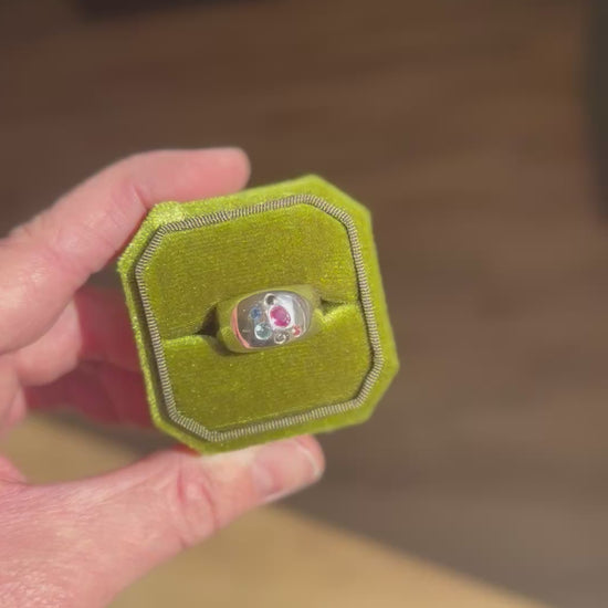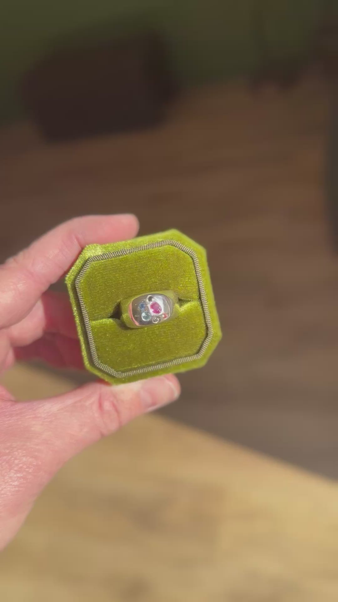 Handcrafted sterling silver chunky ring set with Lab Grown pink and blue Sapphire, green Tourmaline, orange Citrine, blue Topaz and black Cubic Zirconia, with a high shine polished finish, currently set in O, but can be resized and comes with a beautiful gift box.