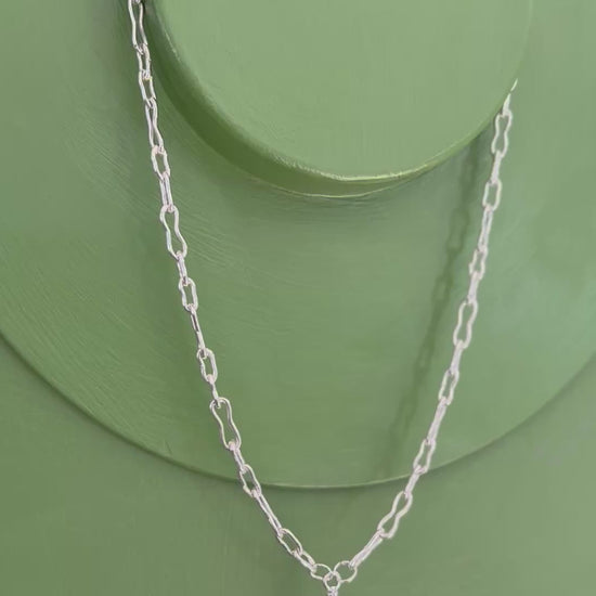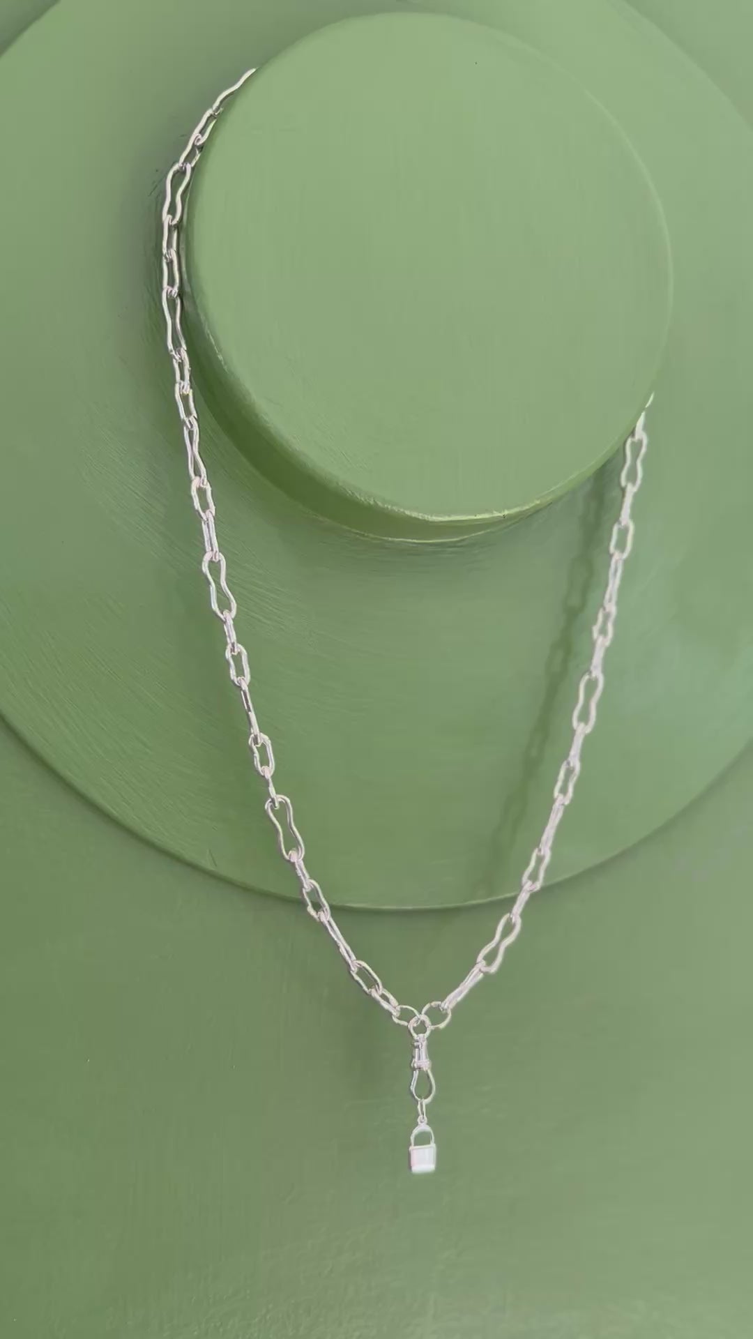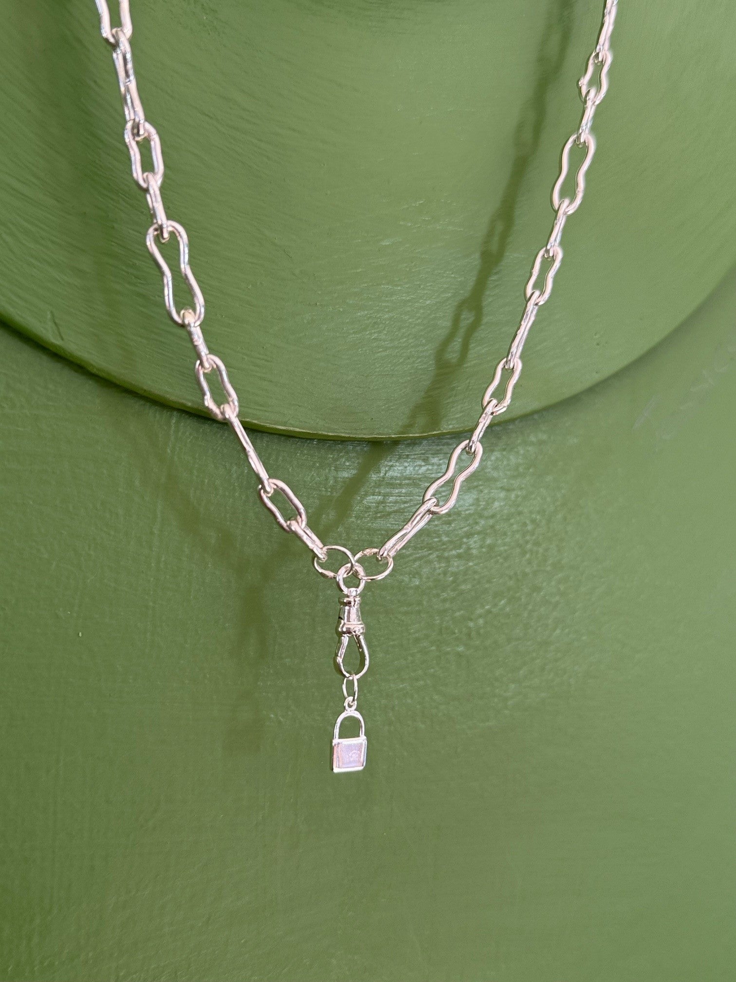 Handcrafted sterling silver crush link chain, with padlock pendant and solid albert swivel clasp. Chain is made with a chunky 2mm/12gauge wire, 60cm length, can be worn short or long, pendant at the front or back.
