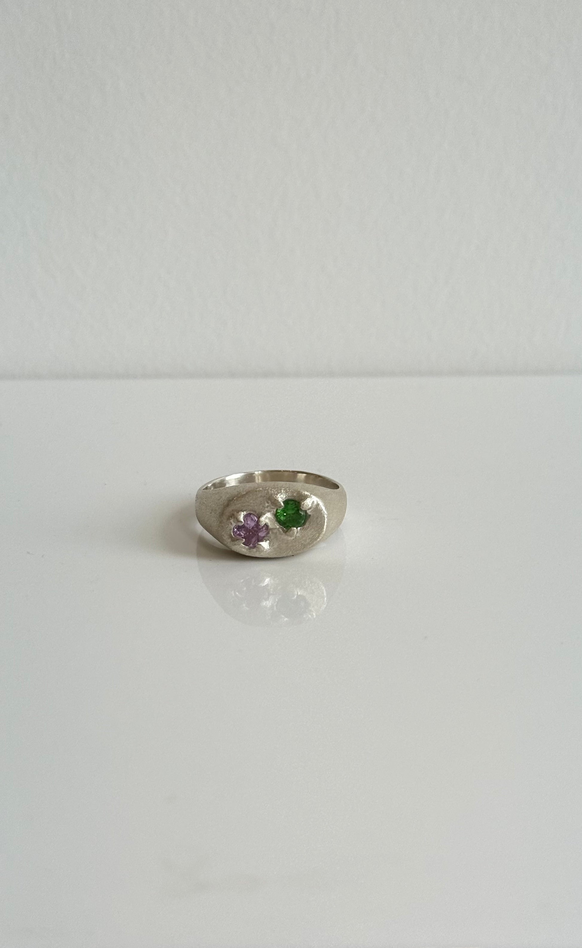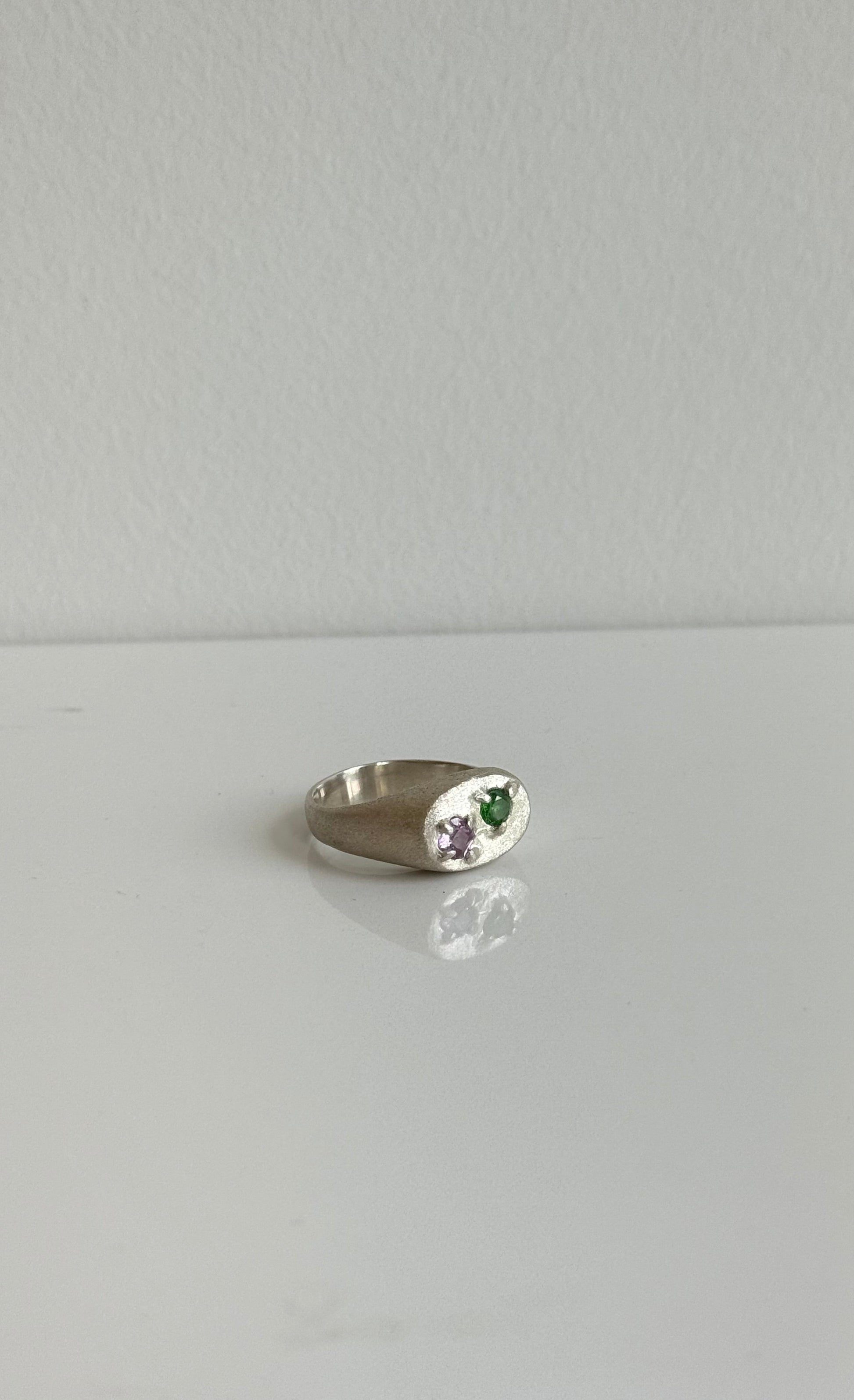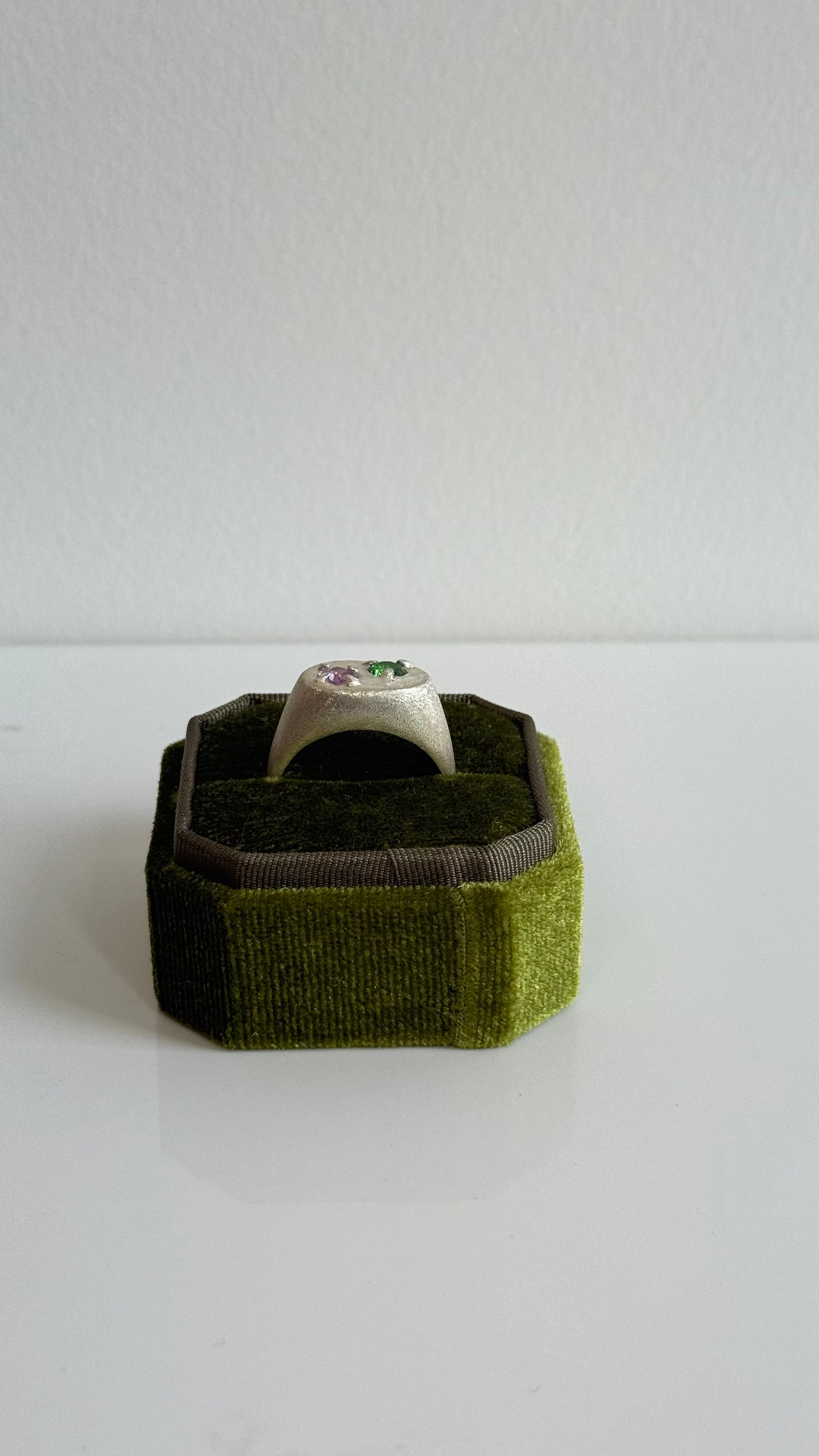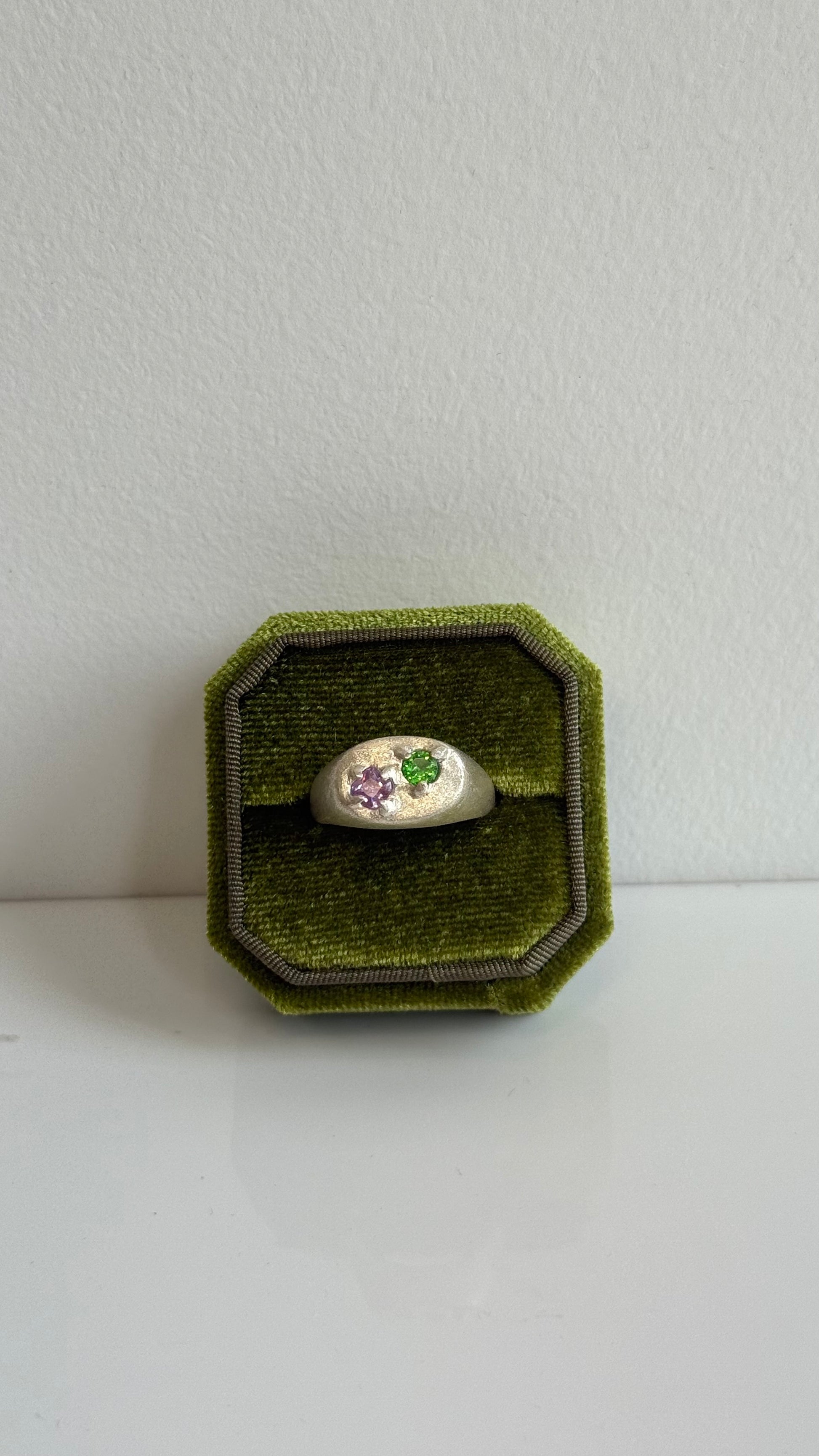 Handcrafted sterling silver Watermelon Crush ring with a satin finish and chunky signet, with green tsavorite and amethyst, set in a R size but can be resized and sent in a beautiful gift box.